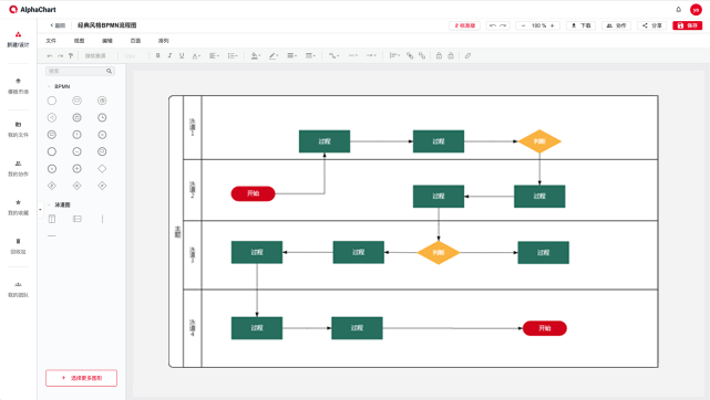 在AlphaChart中每個符號都是矢量的,可以填充顏色,改變大小,定義數(shù)據(jù)和連接。在流程圖標準符號包括4個基本流程符號橢圓形、矩形、箭頭、菱形和5類中高級的流程圖符號。通用流程圖